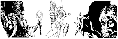 LOOKing at each of the characters gives a little more information about their backstories. Titus is a muscular, intelligent blacksmith who went on the adventure because he lost a bar bet. He starts the game with a broadsword, torch, match, sleep potion, and four pretzels. Eolene is an elven archer with a bow, quiver, rapier, black potion, and elven gourd. With her ancestral forest leveled by human development, she now works as a mercenary. Bruno is a big, slow, fearless barbarian with leather armor and a gnarled tree branch as a club. He's here because Titus told him to be here.